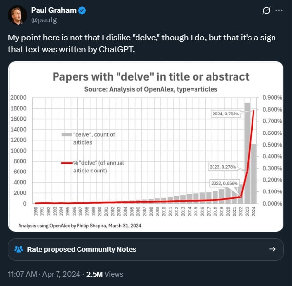 There are frankly too many to list. We could add “realm” here, or “boost,” or plenty more. The point, once again, is not to isolate any one of these words, which can be and surely are used innocently enough by any well-meaning human, but rather the frequency over and above the norm at which AI writes them (e.g., see the delve tweet above).