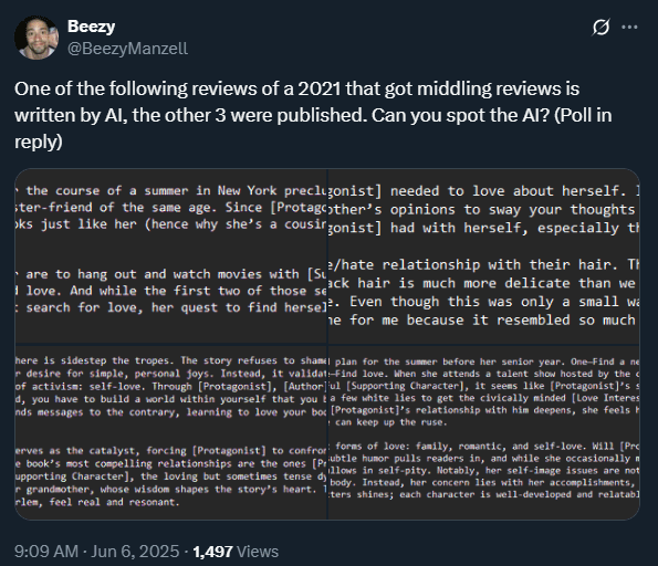 Wait, a fifth? How long does this go on for? Okay, let’s combine these last two: phrasing and coherence. That’s 5 and 6. I could go on at length and extend this list to 10, maybe even 20 distinct items, such as the AI’s preoccupation with tripartite lists of adjectives, but I’ll spare you that fate (for now). At this point, the analysis becomes more vibes-based anyway, so no matter how I gussy it up, the upshot is going to be “channel your inner Rick Rubin and you will know.”